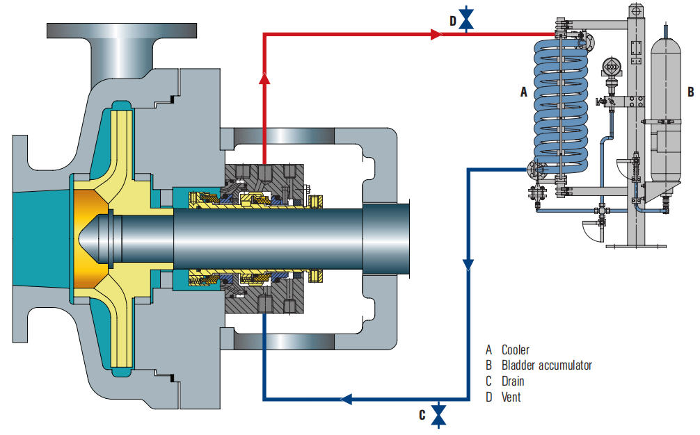 Ang Plano 1 ay hindi nangangailangan ng anumang panlabas na pipelines.Ito ay nagsisilbing panloob na pipeline ng flushing para sa mga mekanikal na seal.Unlike Plan 11, ang flushing pipeline ay hindi nakalantad sa kapaligiran, kaya pinipigilan ang mga mataas na viscosity fluid mula sa pagyeyelo/polymerizing sa mababang temperatura.