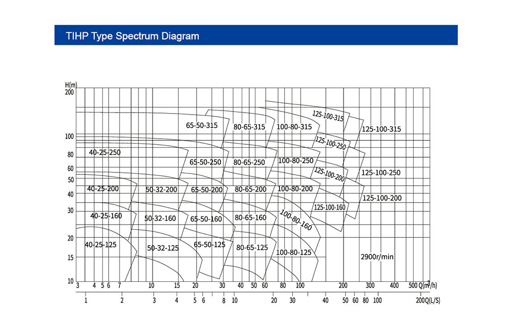 Ang notasyon na "2900 r/min" sa kanang sulok ay nagpapahiwatig ng rate ng bilis ng mga bomba sa spectrum na ito (karaniwang bilis para sa mga bomba na hinihimok ng motor). Para sa iba't ibang bilis (hal., 1450 r/min), gamitin ang batas na pagkakapareho upang mai -convert ang pagganap: